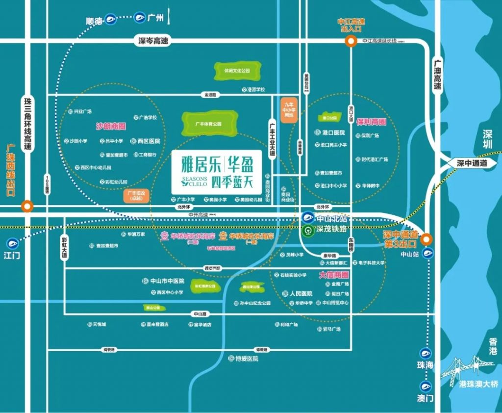 华盈四季蓝天项目位于北环路以北约500米的广丰大道旁,东起星辰花园、依南六涌两旁,项目东南方向1.5公里处为广珠城轨中山北站。 华盈四季蓝天有意将园林打造成以珍贵罗汉松为主题的公园式园林,小区内采用酒店式管理、智能安防、专层智能消防门禁系统等,为住户安全保驾护航。社区内更设有休闲运动广场和儿童公园,丰富住户文体生活。周边的奥园幼儿园、吉的堡幼儿园等,让住户在享受项目的园林景致和便捷的生活配套的同时,还能享受到丰富的教育资源。